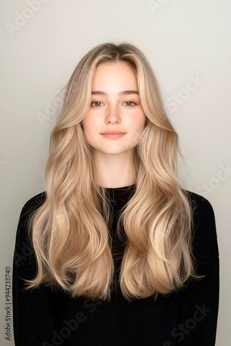 Portrait of a Young Woman with Long Flowing Hair and Calm Expression