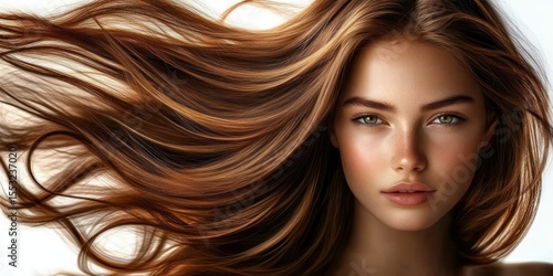 Portrait of a young woman with long flowing light brown hair blowing to the side and soft, serene facial expression
