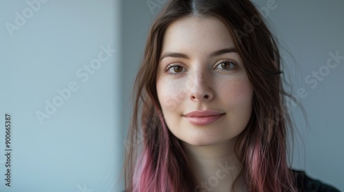 Portrait of a young woman with long hair and subtle makeup. Simple background and natural light enhance her features. Ideal for lifestyle, beauty and fashion contexts. AI
