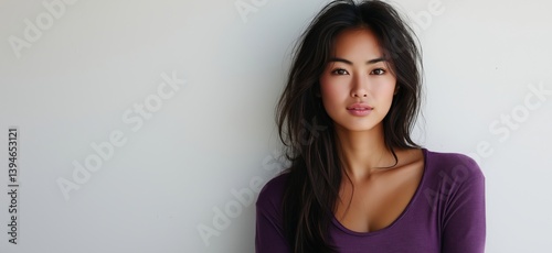 Portrait of a young woman with long hair wearing a purple top against a neutral background