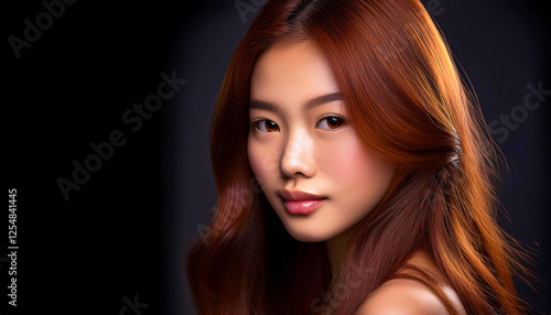 portrait of a young woman with radiant auburn hair, deep brown eyes, and fair skin. Her smooth complexion and natural makeup enhance her delicate facial features, fashion, skincare, and lifestyle