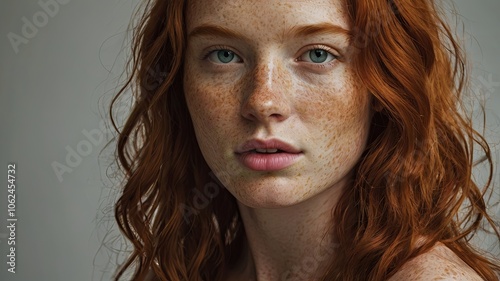 Portrait of a young woman with red wavy hair and freckles looking directly at the camera in soft natural light against a neutral background