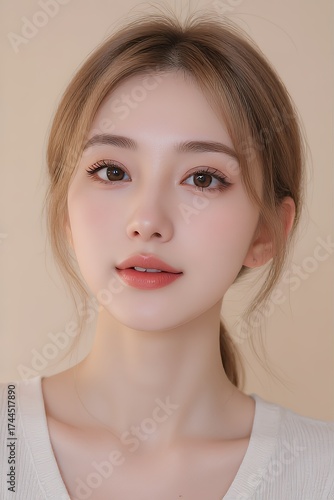 Portrait of a young woman with soft features and a neutral background