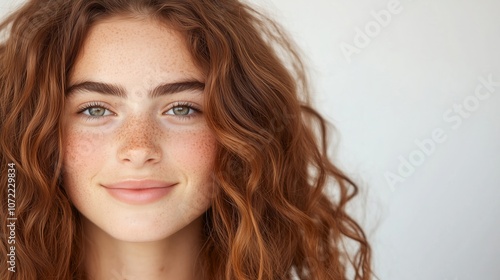 Portrait of a young woman with vibrant red curly hair, natural freckles, and soft makeup, showcasing beauty, confidence, and healthy hair.