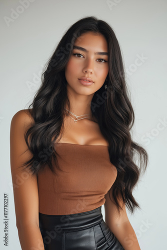 Portrait of a young woman with wavy dark hair wearing an off shoulder brown crop top and leather skirt with a muted background