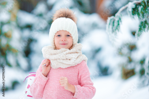Portrait of adorable little girl going skating in winter snow day outdoors
