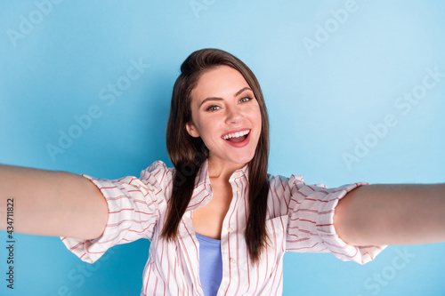 Portrait of adorable satisfied girl take selfie toothy smile enjoy free time isolated on blue color background