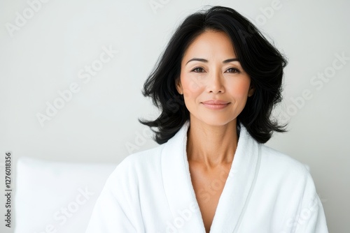 portrait of adult brunette elegant Asian woman 50 years old in white bathrobe on white background, copy space, mature
