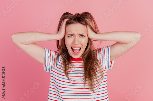 Portrait of aggressive angry furious lady outraged mood yell on pink background