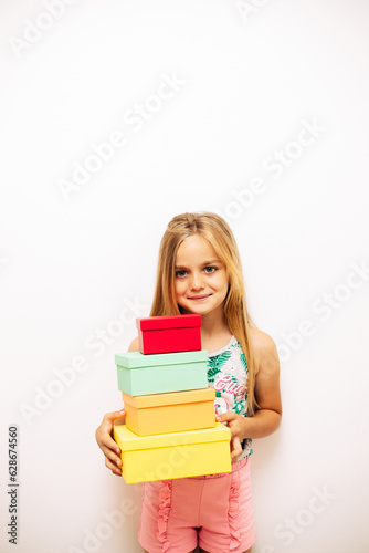 Portrait of an adorable little girl with colorful boxes