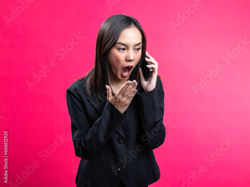 Portrait of an Asian Indonesian woman wearing black office attire, talking on the phone with a surprised expression. Isolated against a magenta background.