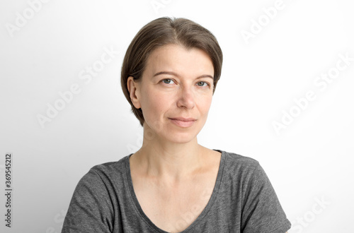 Portrait of an attractive woman on a white background. Pretty smiling middle-aged woman.