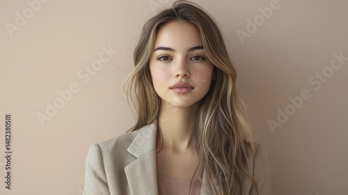 Portrait of an Attractive Woman with Wavy Hair Wearing a Beige Blazer
