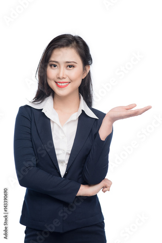 Portrait of an attractive young businesswoman showing by hands isolated on white.