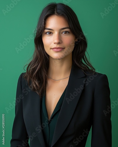 Portrait of an elegant young woman in a dark blazer against a green backdrop, representing confidence and professionalism, ideal for business and corporate themes.