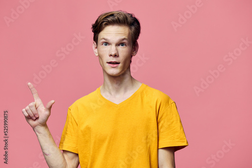 portrait of an emotional guy in a yellow T-shirt gesturing with his hand