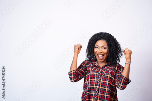 portrait of an excited pretty young african woman sitting at a desk, happy and celebrating