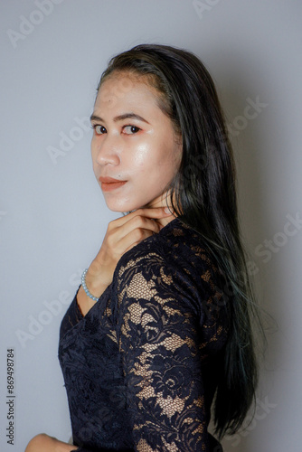 portrait of an Indonesian woman wearing a black kebaya in the studio with a disheveled pose isolated white background