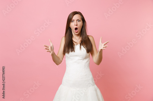 Portrait of angry shocked bride woman with opened mouth in white wedding dress standing spreading hands isolated on pink pastel background. Wedding celebration concept. Copy space for advertisement.