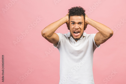 Portrait of angry young good-looking tan-skinned male student with afro hairstyle in casual, looking in camera with excited face expression