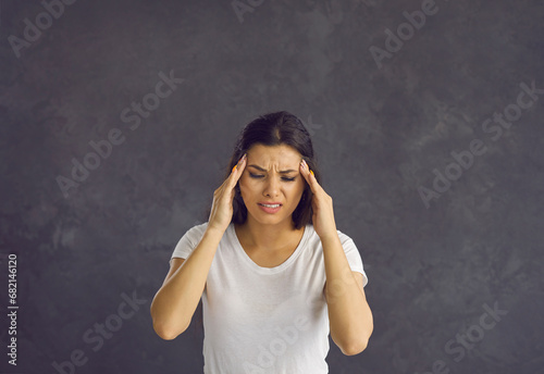 Portrait of anxious young woman touching her temples feeling severe headache and stress. Caucasian brunette woman feels despair over pain and migraine. Healthcare concept. Gray background. Studio shot