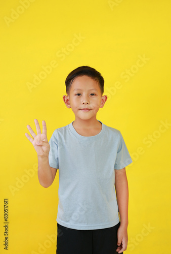 Portrait of Asian boy child show four fingers and looking straight while standing isolated on yellow background.