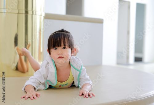 Portrait of asian child girl in swimming suit looking straight and lying on sofa.
