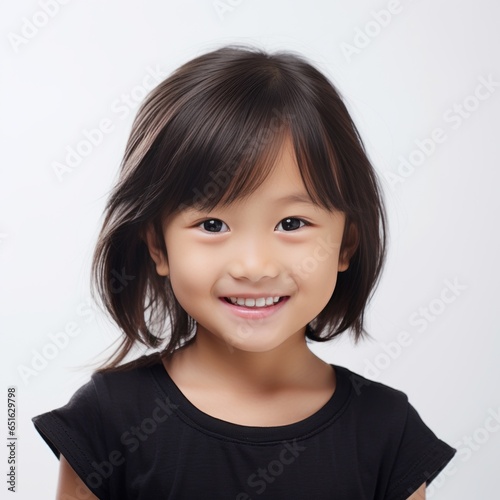 portrait of asian female child looking at camera and smiling, white background