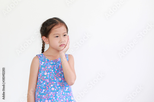 Portrait of asian little child girl touching hand on chin and cheek isolated on white background with looking out.