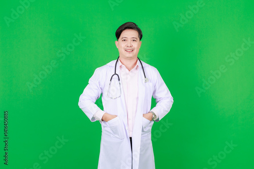 Portrait of asian middle aged confident man doctor in white coat with stethoscope standing posing looking at camera on green background, Consultation healthcare professional concept.