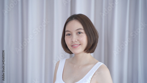 portrait of asian woman short hair in white smiling confidence face expression on background. attractive beautiful female 30's dark brown hair posing for fashion. confident and thinking act.
