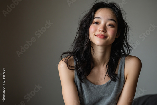 Portrait of Asian woman with radiant, glowing skin peaceful expression. focusing on her natural beauty and luminous skin.