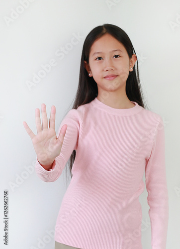 Portrait of Asian young girl show stop sign gesture isolated on white studio background. Focus at palm hand.