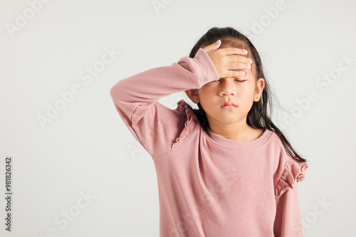 Portrait of Asian young kid girl sad tired strain face holding hold head by hands, stress kindergarten child person unhappy closed eyes problem headache, studio shot isolated on white background