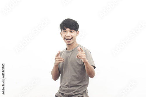 portrait of asian youth wearing gray t-shirt with pointing expression