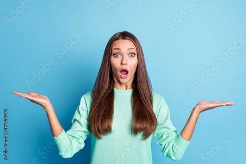 Portrait of attractive amazed brown-haired girl holding on palms copy space advert isolated over bright blue color background