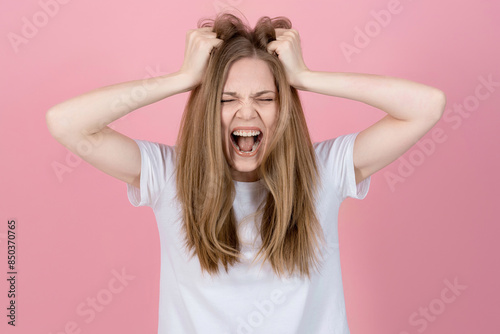 Portrait of attractive, angry and aggressive caucasian young blonde woman in casual white t-shirt with closed eyes isolated on pink studio background. Nervous, divorce, difficulty.