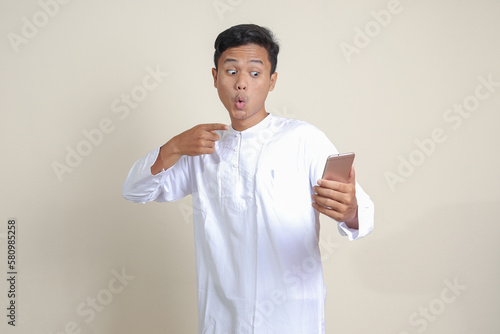 Portrait of attractive Asian muslim man in white shirt holding mobile phone and covering mouth with shocked expression on face. Isolated image on gray background