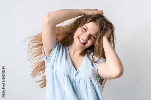 Portrait of attractive carefree european girl, tilting head up and shaking curly hair. Living life to fullest. Having fun and being amused.
