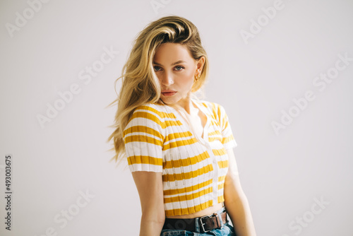 Portrait of attractive caucasian young woman with blonde hair isolated on white background.