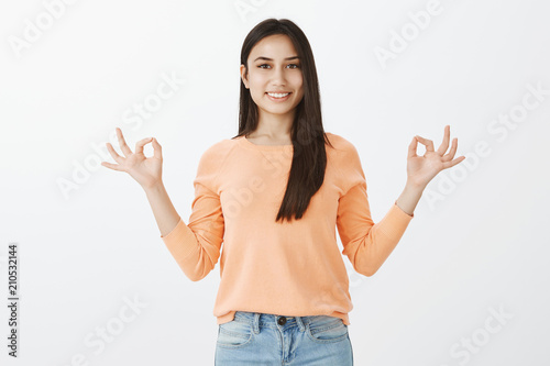 Portrait of attractive charming girl with tanned skin, raising hands spread with zen gesture and smiling broadly while gazing at camera, meditating or teaching yoga, standing over gray background