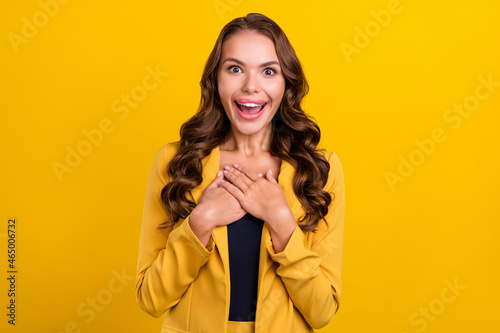 Portrait of attractive cheerful amazed wavy-haired woman enjoying good news isolated over bright yellow color background