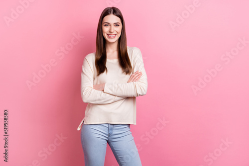 Portrait of attractive cheerful content brunet girl folded arms isolated over pink pastel color background
