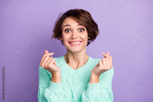 Portrait of attractive cheerful funny brown-haired girl showing love gesture isolated over violet purple color background