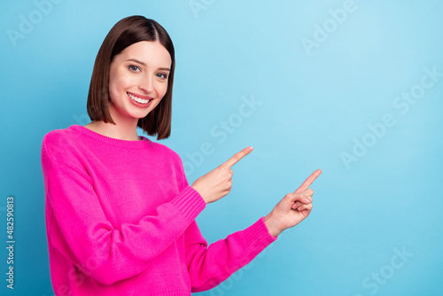 Portrait of attractive cheerful girl demonstrating copy blank place space isolated over bright blue color background