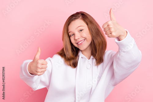 Portrait of attractive cheerful girl giving double thumbup ad advert cool solution isolated over pink pastel color background