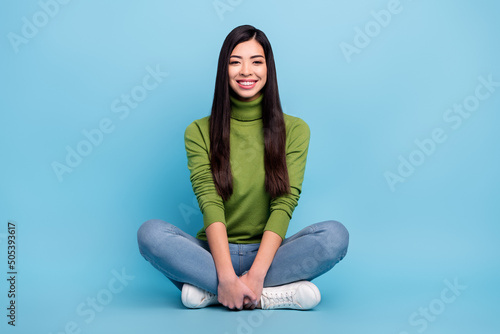Portrait of attractive cheerful glad confident girl sitting lotus pose shopping day isolated over bright blue color background