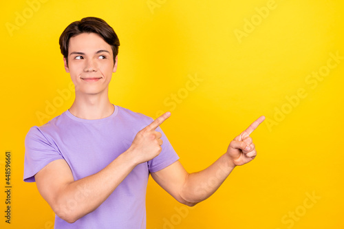 Portrait of attractive cheerful guy demonstrating copy space place ad advert solution way isolated over bright yellow color background