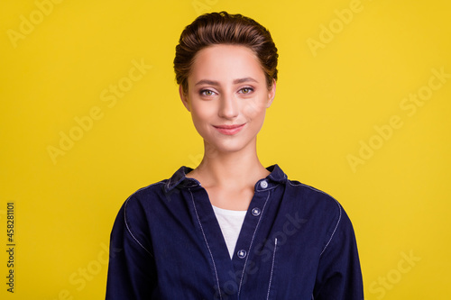 Portrait of attractive cheery content girl wearing cozy dressing isolated over bright yellow color background