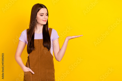 Portrait of attractive cheery curious brown-haired girl holding on palm copy blank space ad isolated over bright yellow color background